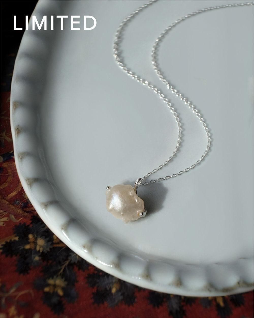 胸元にひとつ、コロンとした姿が愛らしいバロックパールのネックレス。